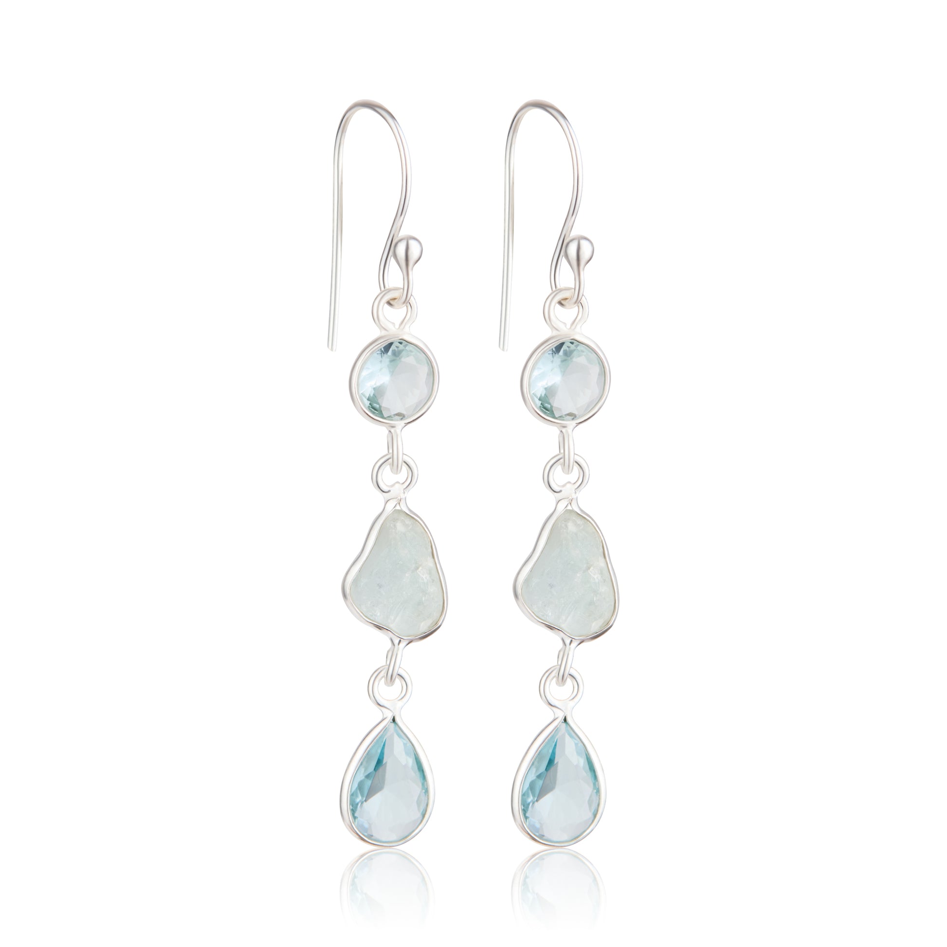 The upper round topaz adds brilliance, while the centre stone introduces a natural, fluid shape. The pear-cut drop at the base completes the design with refined symmetry and gentle shimmer. The varying cuts and subtle shades of blue create depth, making these earrings both striking and sophisticated.