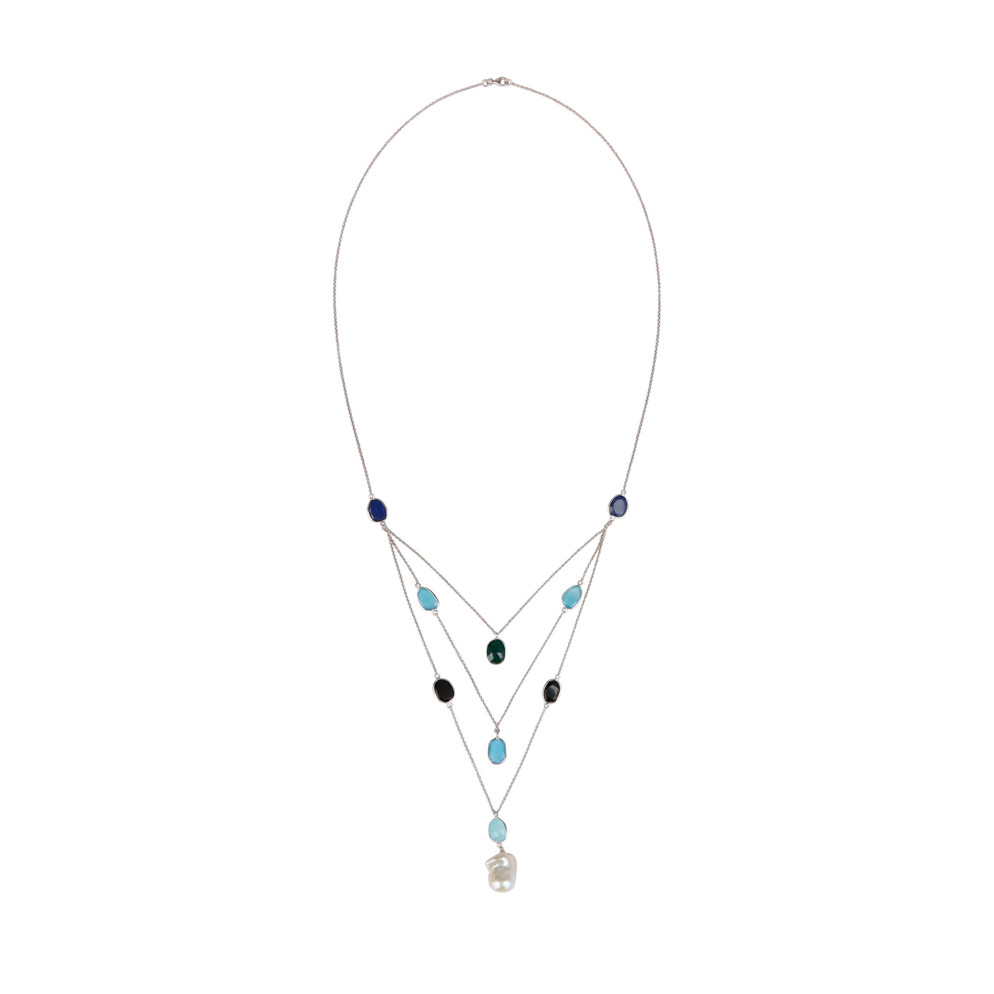 Elevate your style with this stunning layered necklace crafted in sterling silver with white rhodium plating for added brilliance and tarnish resistance. The design features an elegant cascade of faceted and cabochon-cut gemstones, each bezel-set and thoughtfully arranged for visual harmony.